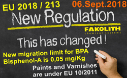 La regulación EU 2018/213 que modifica el EU 10/2011, desde el 6 de septiembre de 2018 prohíbe el uso de aquellas pinturas para contacto directo con alimentos que no cumplan con estos nuevos requisitos: