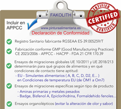 • La primera pintura alimentaria epoxi 100% sólidos que además tendrá certificación dual, es decir cumplirá el reglamento EU 10/2011 y a la vez la FDA 21 CFR 175.300. Una garantía de calidad que facilita el acceso a mercados internacionales.