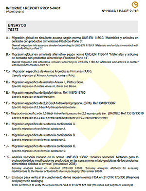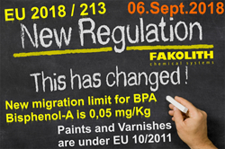 Por ejemplo, todos los recubrimientos y envases siempre deben cumplir con los límites máximos de migraciones específicas de aminas aromáticas y metales pesados entre otros, pero además con los específicos a su formulación; por ejemplo, en el caso de productos basados en resinas epoxi, se debe cumplir entre otros tantos con el límite máximo de migración específica de Bisfenol A del último Reglamento UE 2018/213, que redujo 10 veces el LME permitido de BPA, pero además debe cumplir con el Reglamento específico para este grupo epoxi, el CE 1895/2005, que contempla otra serie de migraciones específicas como BADGE, NOGE, BFDGD, etc...