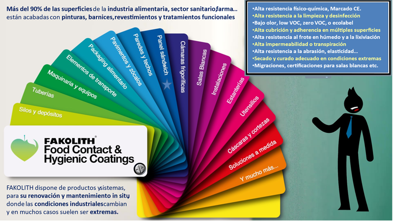 Si bien la función primaria de las pinturas, barnices y recubrimientos FoodGrade de FAKOLITH es evitar la migración de sustancias tóxicas a los alimentos y a sus entornos de fabricación, esta gama no se utiliza exclusivamente para el contacto directo, sino también dadas sus prestaciones y la demostrada efectividad antimicrobiana contra microorganismos patógenos, se utiliza en múltiples superficies del sector alimentario, sector sanitario, sector farmacéutico e industria en general.