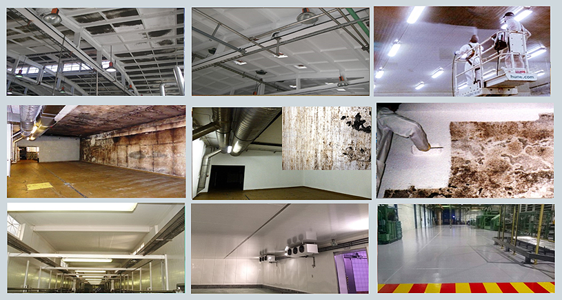 Un claro ejemplo de contacto indirecto con alimentos son los techos, paredes, suelos y otras superficies de las industrias de transformación alimentaria, donde las gotas de condensación pueden arrastrar contaminantes químicos y biológicos hacia los alimentos, pudiendo causar contaminaciones cruzadas.